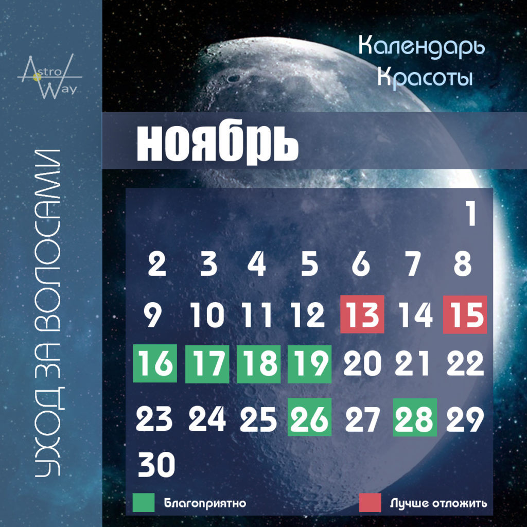 Листопадові процедури догляду за собою принесуть гармонію внутрішніх відчуттів та зовнішніх посилань. Тому всі зміни у зовнішності будуть наголошувати на тому, як ви почуваєтеся всередині. Це не означає, що ми виберемо найкращі образи для себе, але в цих образах ми точно почуватимемося комфортно. У першій половині місяця будь-який догляд за собою допоможе зменшити можливу напругу у відносинах із протилежною статтю. У середині місяця косметичні процедури та покупки дозволять спокійніше поставитися до напруги у соціальному житті. 23 листопада Венера перейде на знак Скорпіона – дуже енергетично насичений період. У цей час чудово проводити процедури оновлення, омолодження – будьте певні, що це сприятиме накопиченню у вас сексуальної енергії. Якщо хочете розпочати регулярні тренування, то зробіть це 16-17 листопада. Догляд за волоссям: Періоди сприятливі для стрижки та укладання волосся у листопаді: 16, 17, 18, 19, 26, 28. Найкращий день для змін у зовнішньому вигляді 18 листопада – стрижка йди купівля одягу відкриють нові можливості. Дні, коли навіть не мити голову: 13, 15.