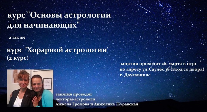 Вже цієї суботи два наших лектори Анжела Громова та Анжеліка Журавська приїдуть до Даугавпілса для початку своїх курсів. Анжеліка -1 курс «Основи астрології» та Анжела – 2 курс «Хорарна астрологія». Час початку курсів 11:30, адреса м. Даугавпілс, вул. Саулес 38 1 поверх (вхід з двору в арку (напроти магазину Delera)