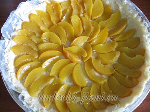 Персики наріжте скибочками та викладіть на тісто в один шар.