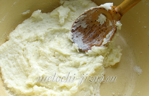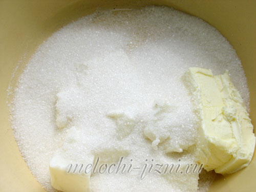Як приготувати пиріг з консервованими персиками Заздалегідь – за годину-півтори – дістаньте вершкове масло та кулінарний жир із холодильника. З'єднайте їх із цукром і ретельно розітріть масу дерев'яною ложкою.