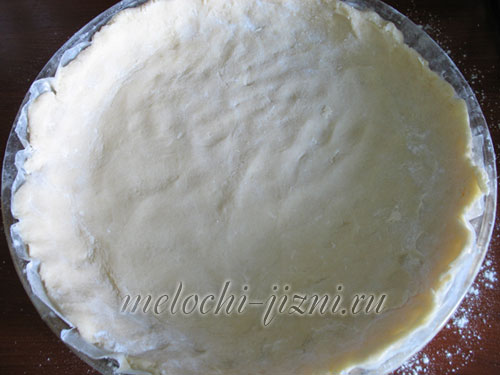 Застеліть круглу скляну або сталеву форму діаметром 28-30 см папером для випікання, рясно змастіть олією. Якщо у вас є силіконова форма відповідного розміру, використовуйте її. Покладіть тісто у форму, присипте борошном і руками сформуйте корж із невисокими бортиками.