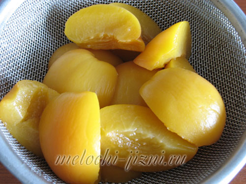 Викладіть персики з компоту на сито і залиште на півгодини, щоб сироп стек.